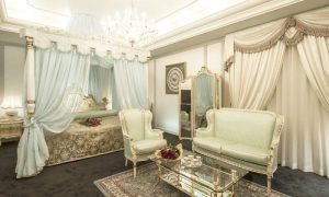 本物のロココ様式の姫家具やコリント式の柱、ヨーロッパから輸入された鏡台やテーブル、ウィリアム・モリスの壁紙、ろうそくの明かりをイメージした照明など、ヨーロッパ風のこだわりで作り込まれています。