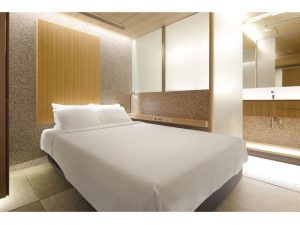 茶室からイメージをインスパイアされたお部屋は、温かな木目と目に優しい色合いの壁材、天然の石などが使われています。シャワーはあるものの浴槽はなく、徹底的にミニマルなスタイルをとっています。
